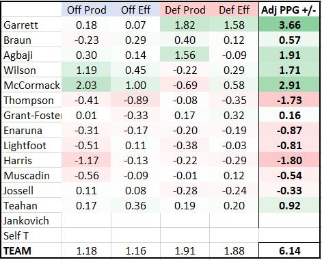 • If starters could play all 200 minutes at same pace, KU would be about 4 ppg better. It isn’t unique for starters to be five best players, obviously. It is unique for all rotation bench pieces (save TGF) to be negative.