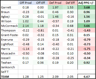 - The TEAM for the season is up to +6.67 per game. This is still shy of the forecasted +8.00, but trending in the right direction. The Baylor game was the team’s 3rd best opponent-adjusted performance.