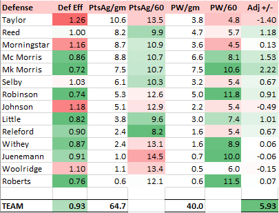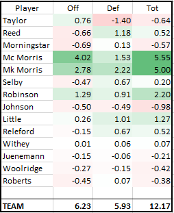 The 2011 offense was based heavily on the interior, with PF Marcus Morris producing the most value of anyone at +4.02. Markieff Morris and reserve Thomas Robinson were also efficient and productive, adding +2.78 and +1.29 points of value per game. The point production was fairly balanced among the main guards, although aside from Josh Selby it was clear that the role of the guards was to be facilitators first. The team’s true shooting was fairly balanced, again aside from Selby who took too many shots. This suggests the other players took shots at a sensible frequency that would best help the team win.