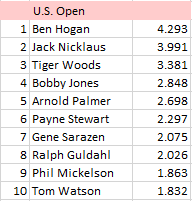 The first column, “Posts,” counts the number of majors a player finished that gave him at least a 0.1% chance of winning. Nicklaus’s completed 53 majors where his 72-hole total was good enough to at least give him a chance to win, 21 more than second-place Tiger Woods.
