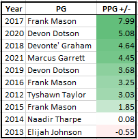 Marcus Garrett led the team with a +4.45 score. He provided the most-valuable defensive season on record (20 seasons) with a +4.03 Def PPG +/- score. The scores confirm what the eye-test tells us, Garrett’s defense was outstanding. Additionally, Garrett provided +0.42 value on offense. Not great, but above replacement-level. Since 2012, Garrett was KU’s fourth-best starting point guard, and not too far below Devonte’ Graham’s 2018 season.