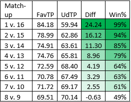 Chart below shows each R64 match-up by seed since 1985. There have been 140 of each of these seed match-ups in total. TP means total points per game, so the 1-seed has averaged 84.18 points when playing the 16-seed, which scores an average of 59.94 points.