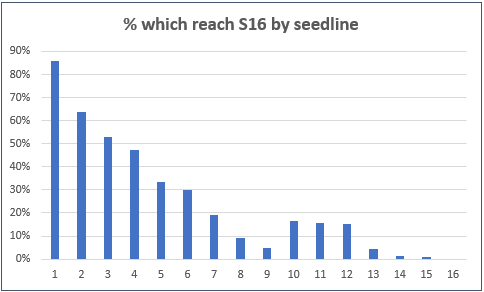 The first chart shows the average number of wins per seed-line (excluding play-in games). Only the top 6 seeds are expected to win at least one game in the tournament, and there is a steady decline as you go down the seed list.
