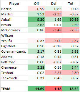 David McCormack: Produced over 8.5 more points than he allowed, while winning more possessions back on defense than he used on offense. This high efficiency allowed him his second-best game of the season at +8.49.