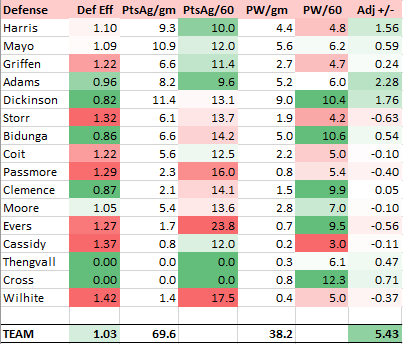 Looking at the Points Against Per 60 column, this shows that Hunter (allowing 12.9 per 60) is worse than the other starters save Furphy (13.0 per 60). However, he is better than his backup Parker Braun (15.4). Additionally, only K.J. Adams (7.9) is significantly better than Hunter at disallowing points. Harris and McCullar have been in the middle-of-the-pack.